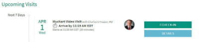 Step 3: Complete eCheck-In, which will be available three days before your appointment. Click the eCheck-In button and complete all the steps. Once you have submitted the last step, your appointment is ready for Video Visit day!